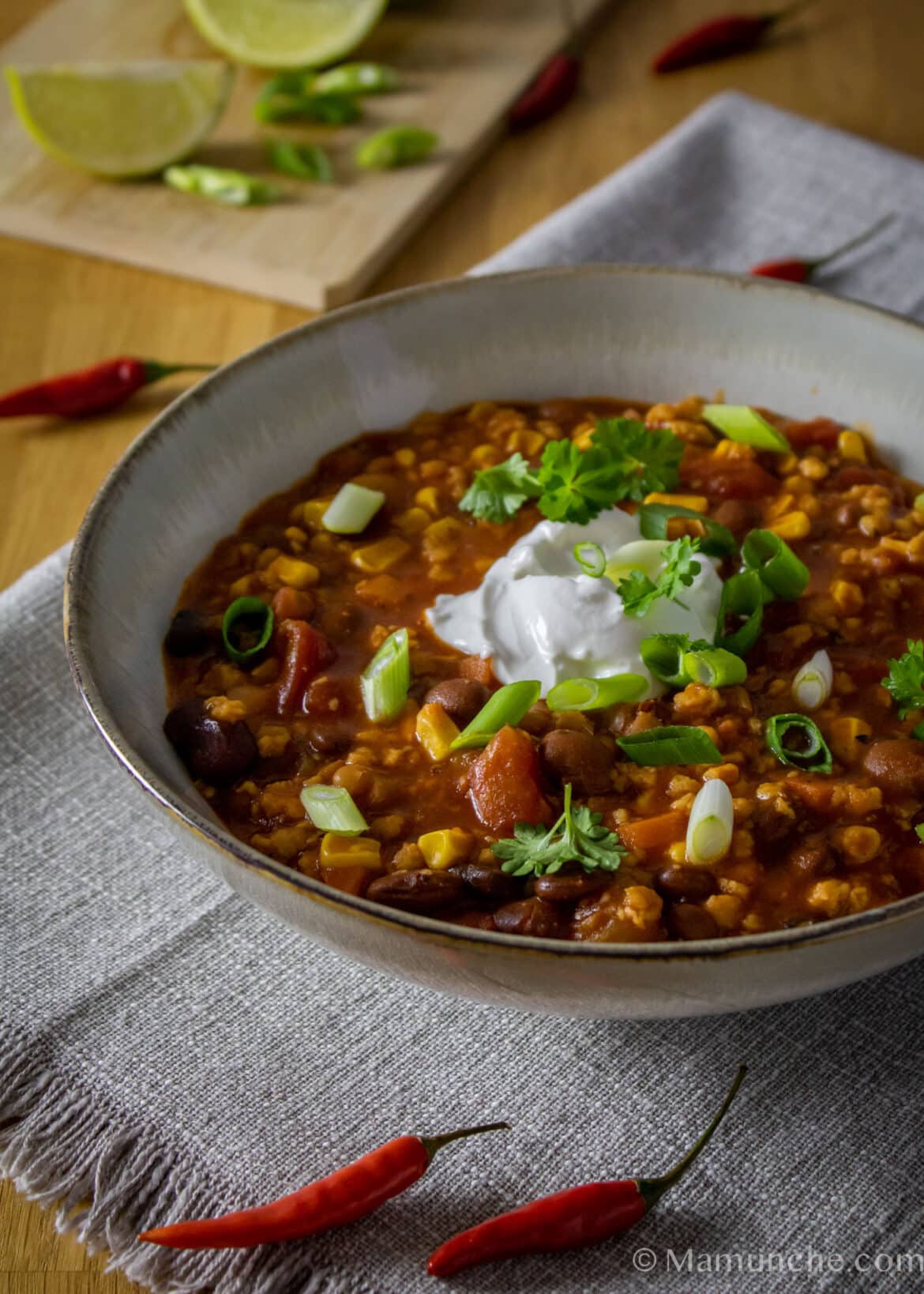Чили кон карне (на испански: chili con carne) е ястие от мексиканската кухнята, което е разпространено и в САЩ. Името буквално означава „чили с месо“, но ние ще заместим със соева кайма. Другите типични съставки са боб и царевица и ястието е предимно доста пикантно, но всеки може да прецени колко люто да прибави.